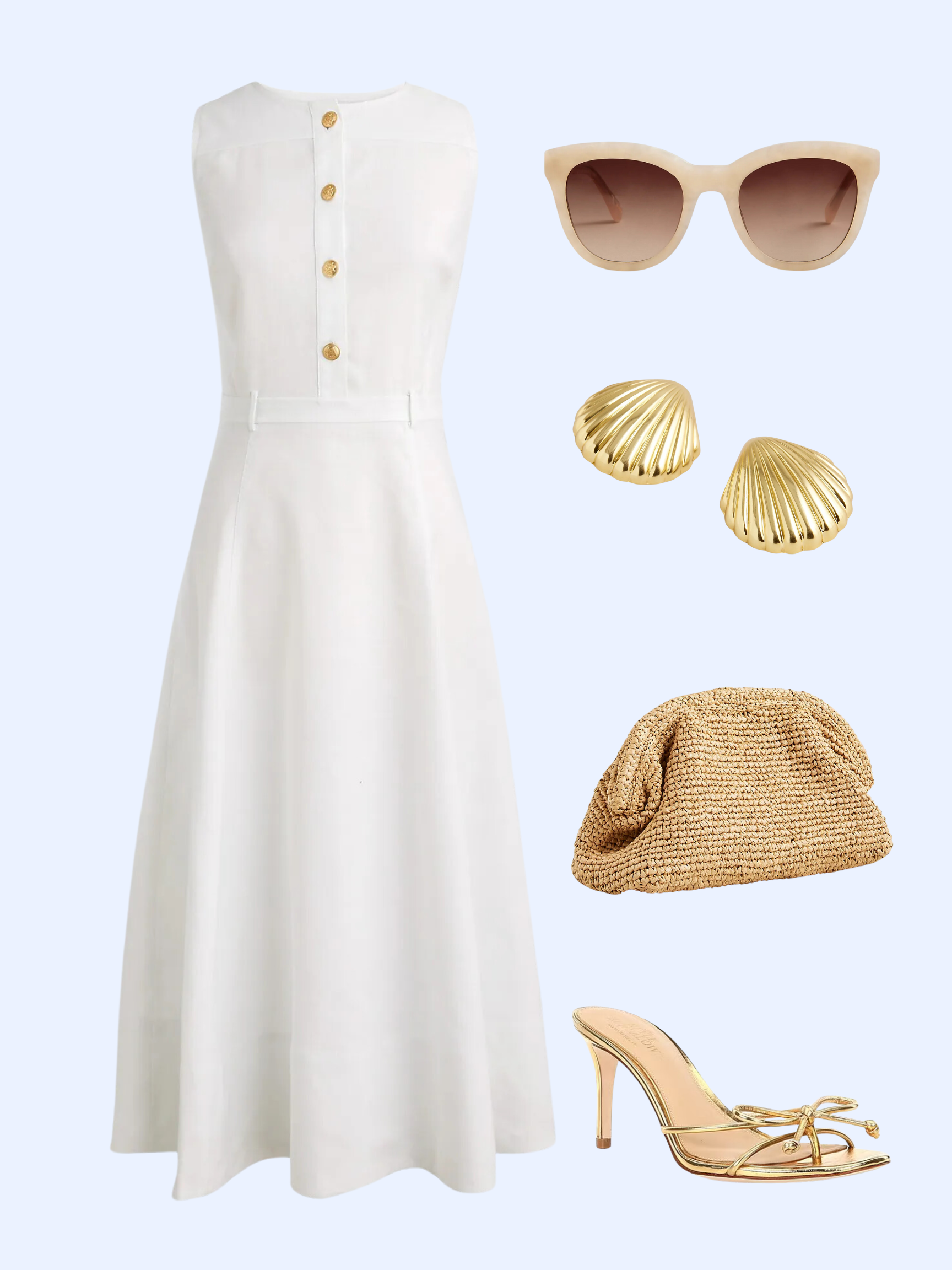 Outfit details: White Midi Dress, Sunglasses, Shell Earrings, Raffia Clutch, Gold Sandals