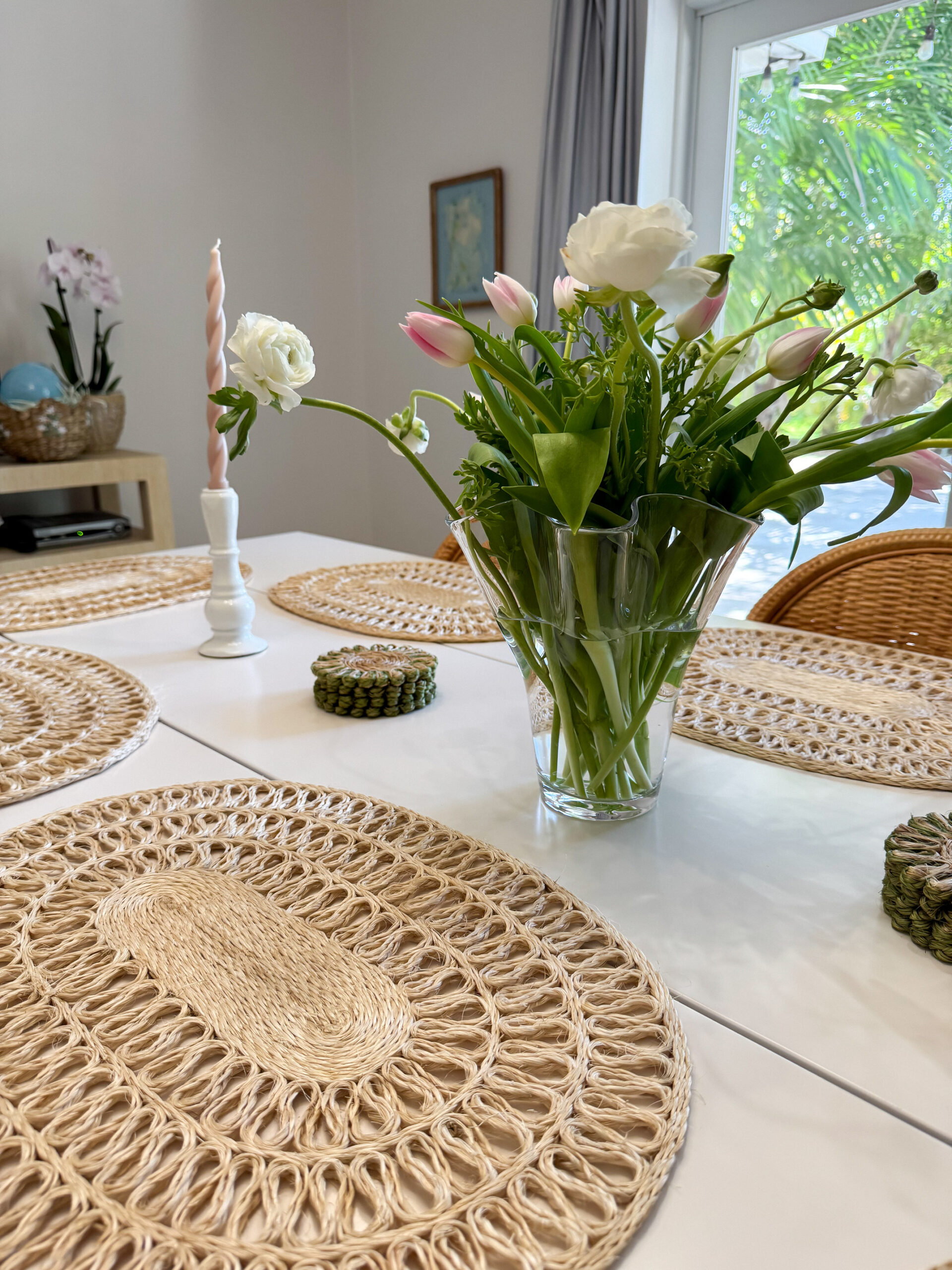 Before we start! Here are all the details of my dining room details in the photo above: dining table / dining chairs / similar place mats / similar vase / candlestick holders / tapers / fine art print on wall / console