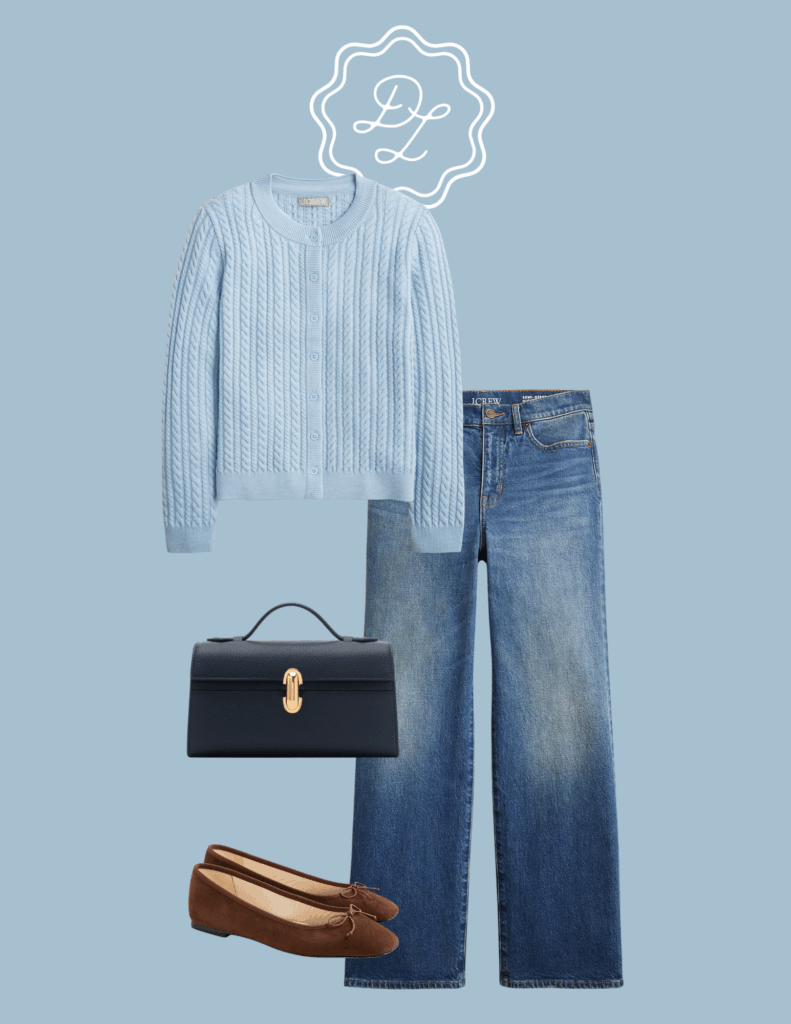 This first look is my absolute favorite, thanks to the gorgeous embellished jeans. I love adding a little sparkle to an outfit in the fall, and J.Crew always seems to get it just right each season. These jeans were simply too perfect to pass up—they pair beautifully with a classic cable knit sweater and my brown suede ballet flats.