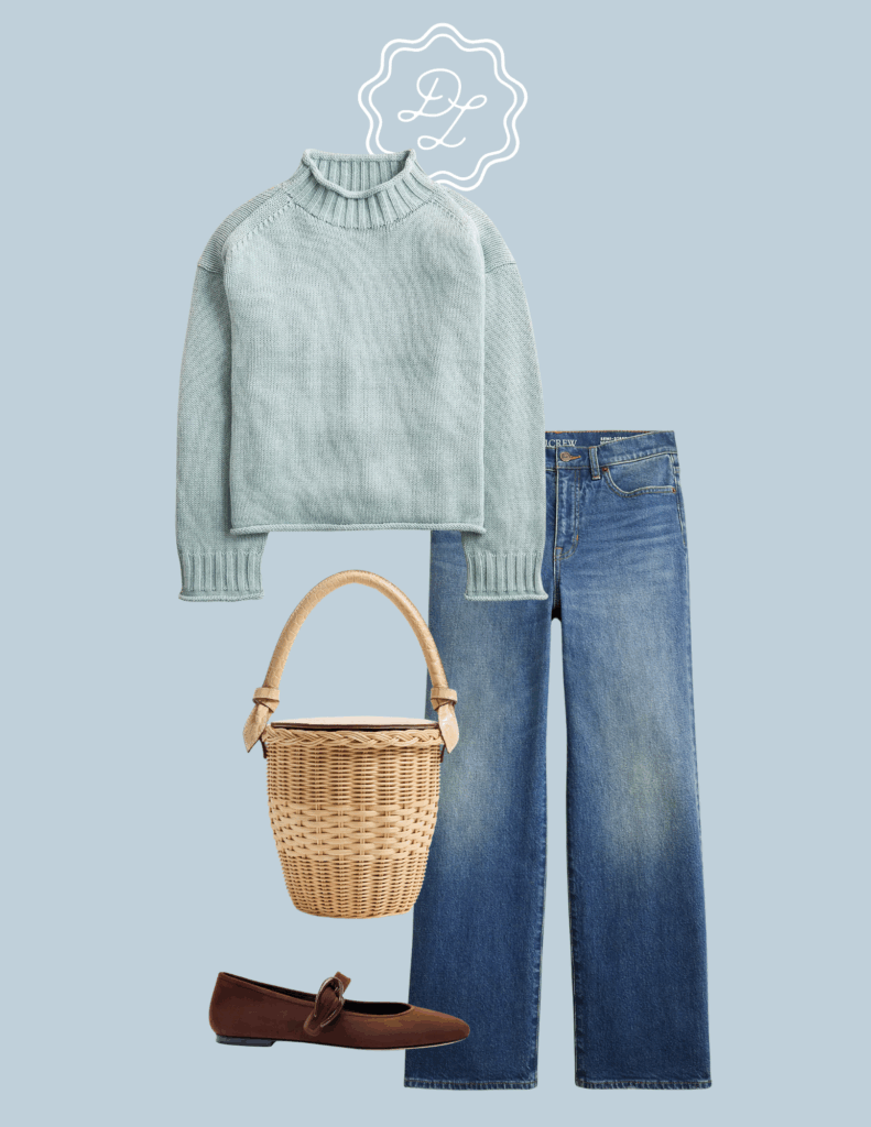A misty blue sweater styled with dark denim, chocolate Mary Janes, and a basket bag. The color combination makes this outfit feel coastal and serene, while still cozy enough for cooler days.