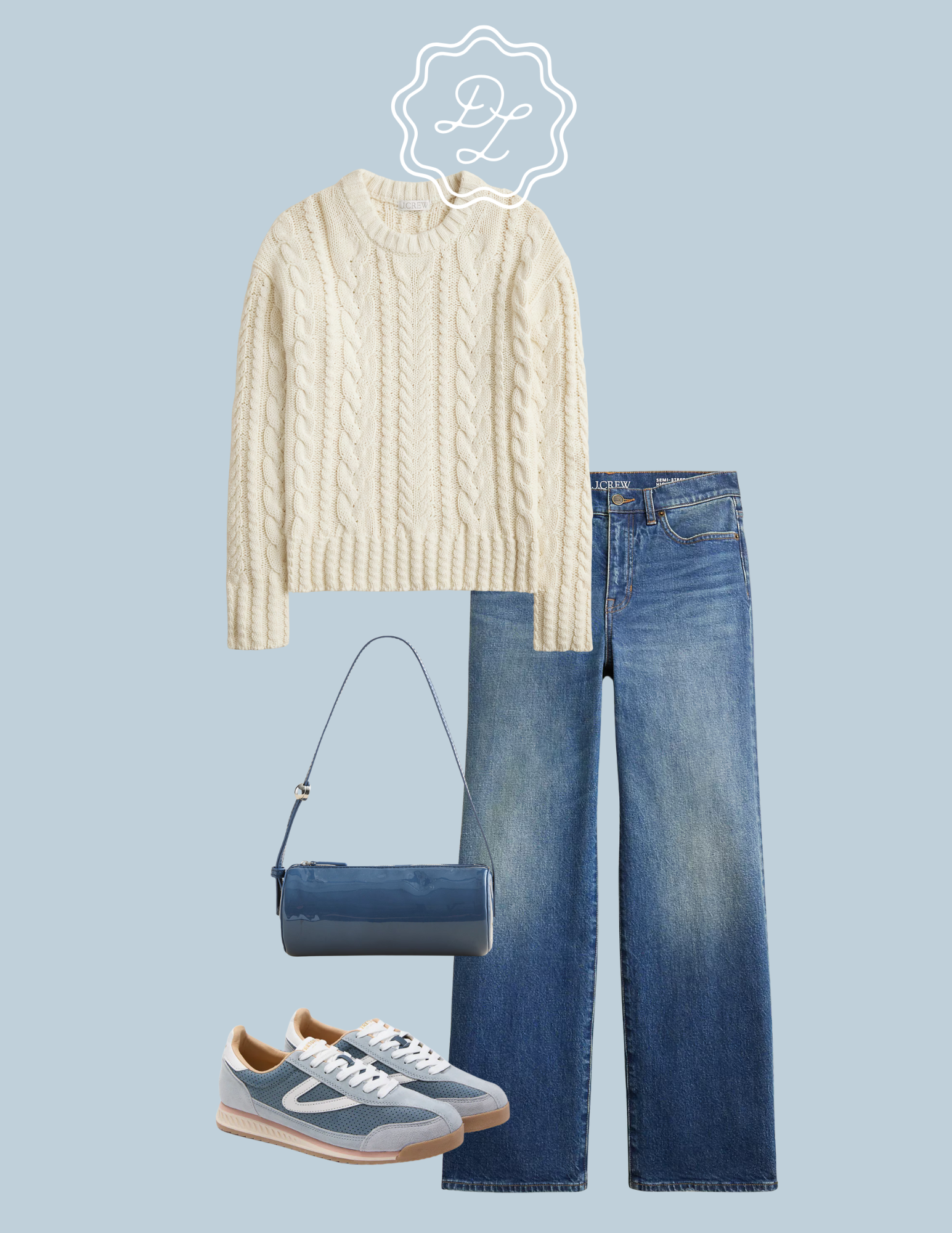 A chunky ivory sweater paired with darker denim, retro-inspired sneakers, and a glossy blue shoulder bag. It’s cozy, casual, and ideal for weekends when you’re on the go but still want to look put together.