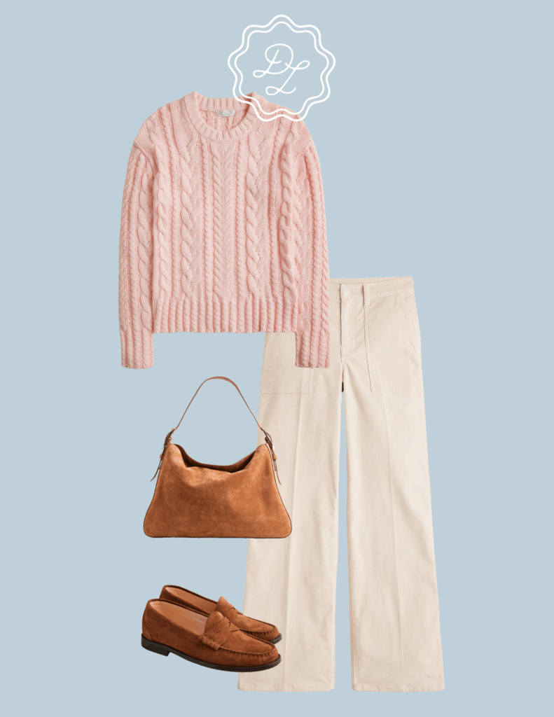 A pale pink cable-knit with ivory wide-leg cords, brown suede loafers, and a matching bag. This one’s such a pretty option for fall afternoons—it feels both classic and fresh, with that little pop of pink.
