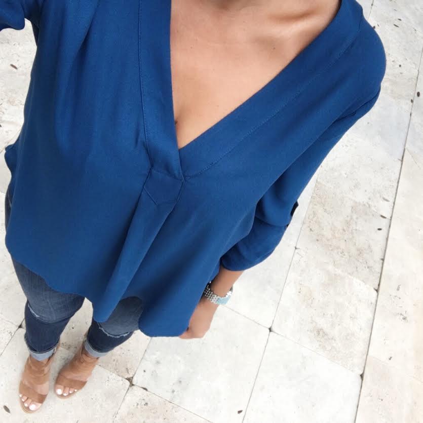 Crepe V-neck Top // Jeans-sold out (similar #NSALE find-see above) // Block Heel Suede Sandal // Essie Fiji Nail Polish // Michele Watch (similar #NSALE find)