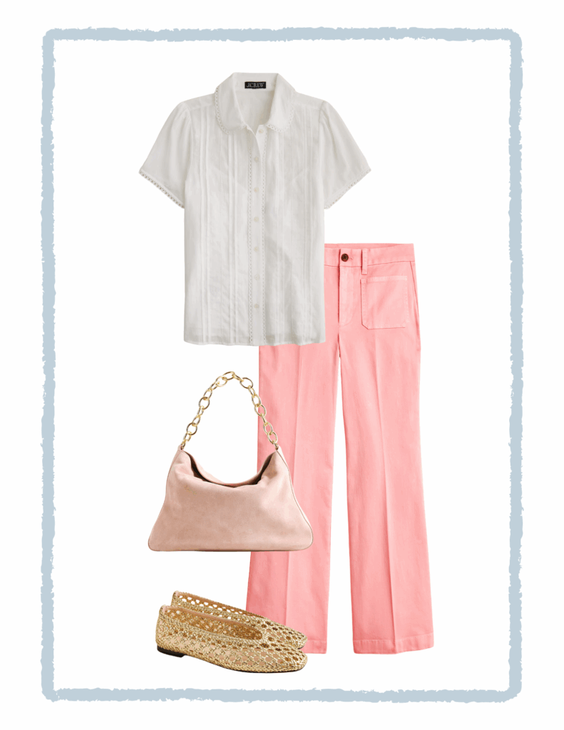 Love these pops of pink for late summer! It’s making my closet so happy! Crisp white blouse, pop-of-color pink pants, and soft accessories that give it that coastal-chic finish. A perfect outfit when you want something cheerful and polished.
