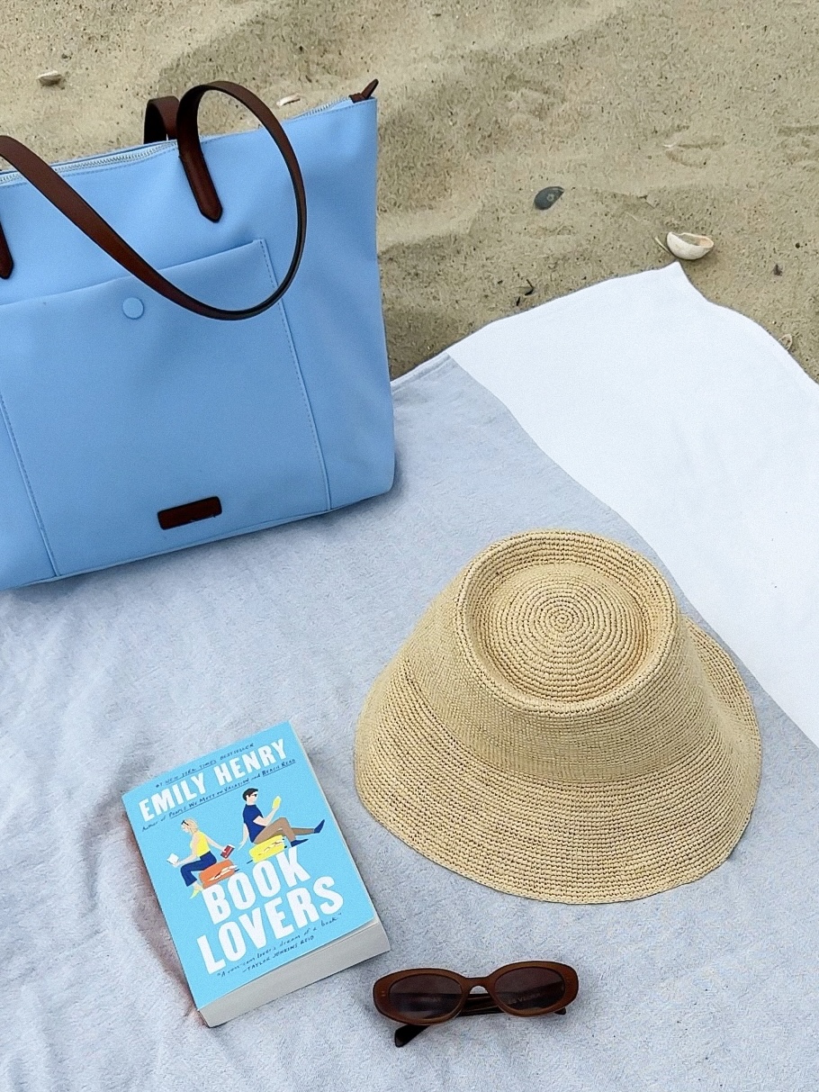 Lands’ End Tote / Janessa Leone Bucket Hat / Monday Swimwear Sunglasses / Emily Henry Book Lovers