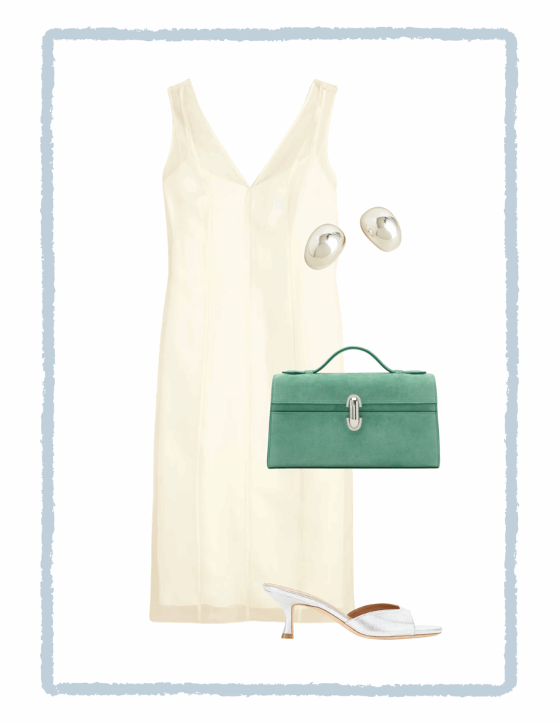 This sleek ivory organza slip dress is pure understated elegance — perfect for a rooftop dinner or an end-of-summer soirée. I paired it with sculptural silver earrings, a fresh pop of sea-glass green in the bag, and silver heeled sandals that make it feel even more polished.